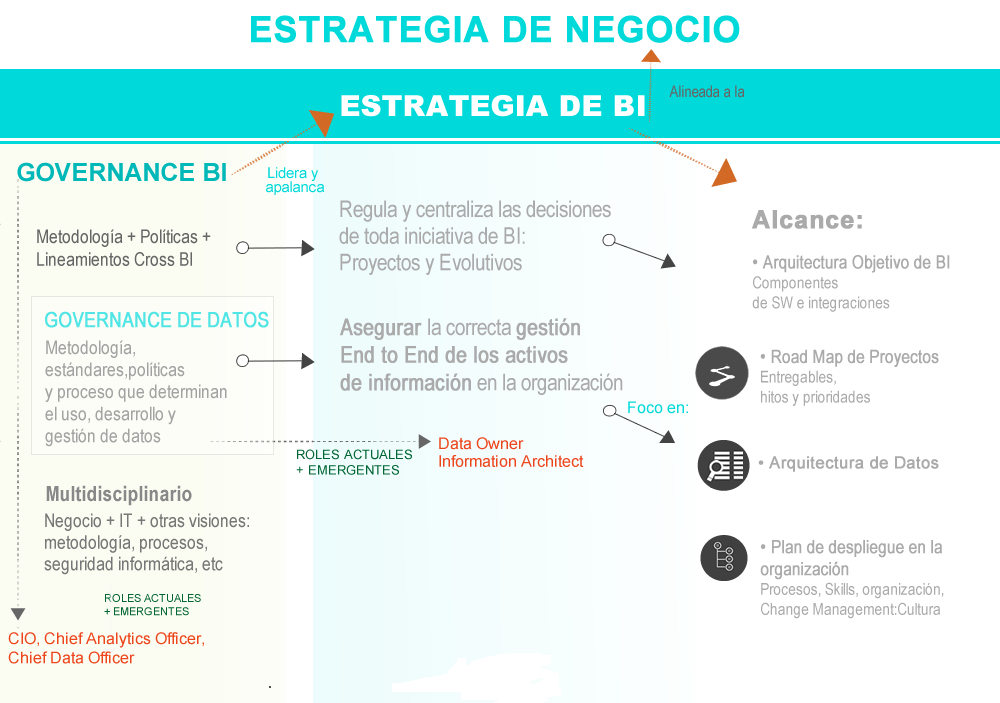 El pilar principal a definir dentro de la Estrategia de BI es la Arquitectura Objetivo, la cual será implementada a través de proyectos planificados bajo un Road Map (también parte de dicha Estrategia). Pero no se trata sólo o principalmente de tecnología, sino que también es protagonista el aspecto cultural bajo el fuerteparadigma que está impactando en las organizaciones respecto a los datos: Organizaciones Data Driven. Es por ello, que también es importante contemplar en la estrategia un Plan de Despliegue, que no es ni más ni menos que preparar los procesos de la organización, definir e impulsar el desarrollo de los skills analíticos y tecnológicos, designar los roles y todo lo necesario para acompañar esta nueva cultura y la Estrategia de BI (CAO, CDO, Data Owners, Information Architects, etc).