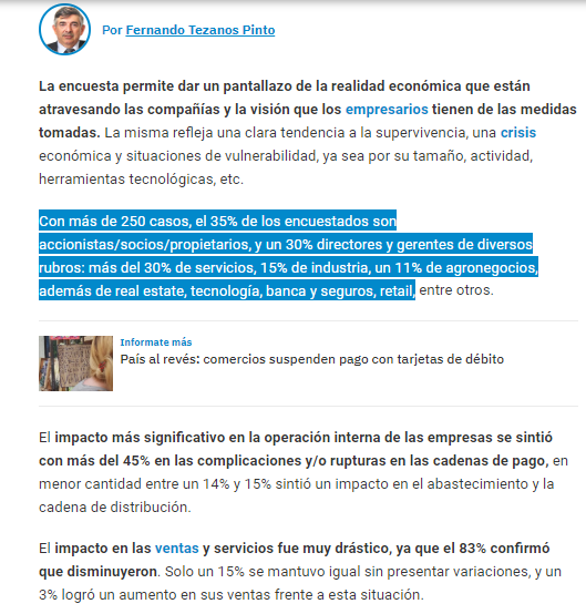 La encuesta permite conocer la realidad económica que están atravesando las compañías y la visión de más de 270 empresarios sobre las medidas tomadas. La misma refleja una clara tendencia a la supervivencia, una crisis económica y situaciones de vulnerabilidad, ya sea por su tamaño, actividad, herramientas tecnológicas, etc.