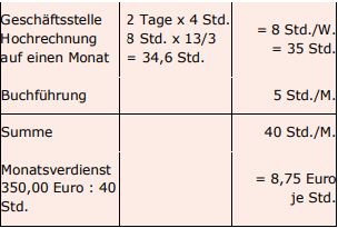 Eine Mitarbeiterin arbeitet zwei Tage in der Woche für je vier Stunden in der Geschäftsstelle des Vereins. Zusätzlich erledigt sie zuhause die Buchführung des Vereins. Im Durchschnitt benötigt sie dafür fünf Stunden im Monat. Ihre pauschale Monatsvergütung beträgt 350 Euro. Der Stundenlohn berechnet sich wie folgt: