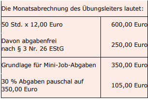 Ein Trainer hat laut Vertrag eine wöchentliche Arbeitszeit von acht Stunden. Er erhält neben einer Vergütung von 254 Euro weitere als Auslagen bezeichnete Beträge: 103,50 Euro Entfernungspauschale für Fahrten zu Training und Heimspielen, 22,50 Euro Reisekostenersatz für Fahrten zu Auswärtsspielen, 20 Euro Auslagenersatz für Telefonkosten, insgesamt 400 Euro.