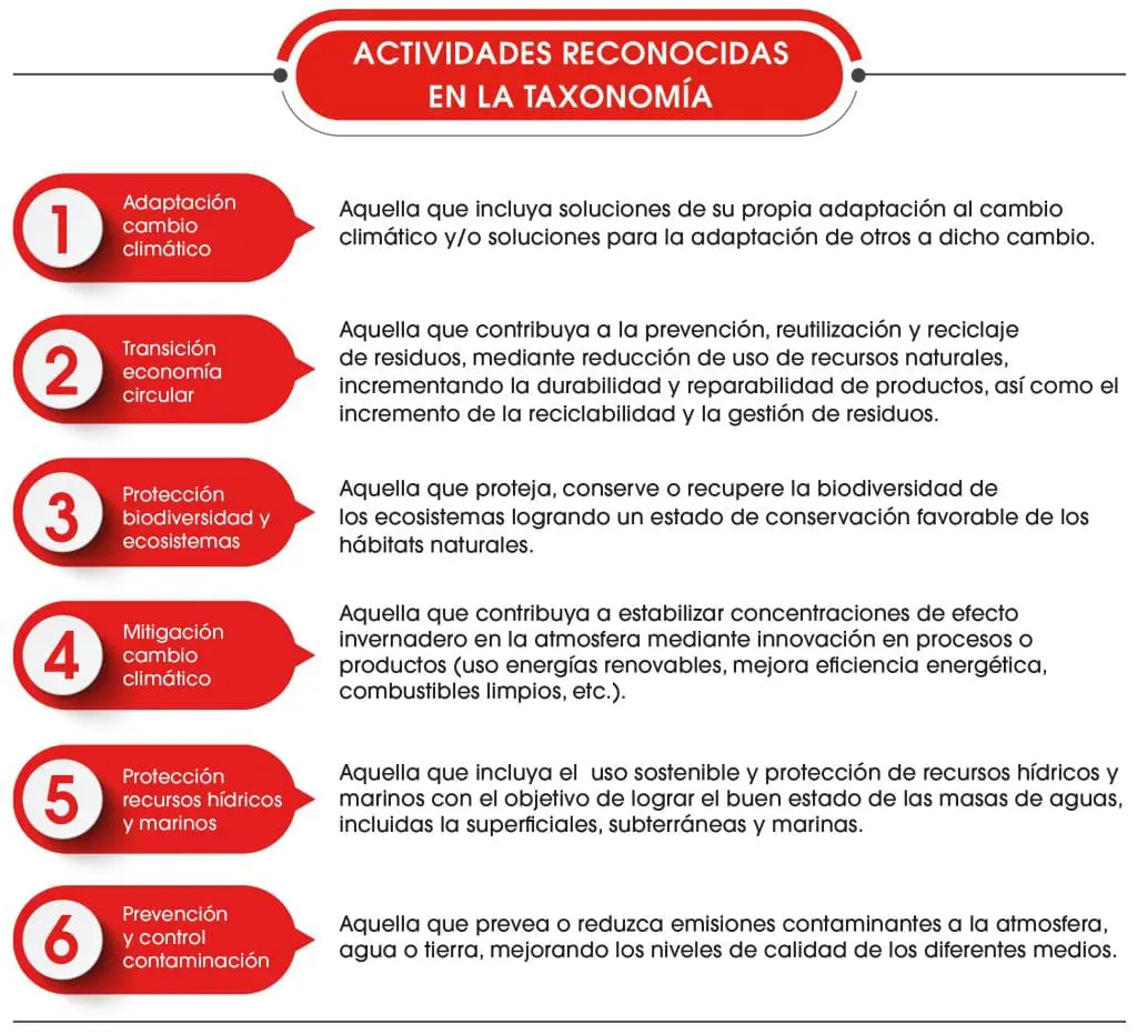 El 18 junio de 2020 se publicó el Reglamento de Taxonomía, que consiste en una clasificación de actividades económicas ambientalmente sostenibles. Su objetivo es incentivar a las empresas a planificar su transición hacia una economía sostenible, alineada con los 17 Objetivos de Desarrollo Sostenible, y asegurar la calidad de la información que reciben los inversores interesados por este tipo de inversiones.