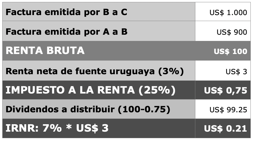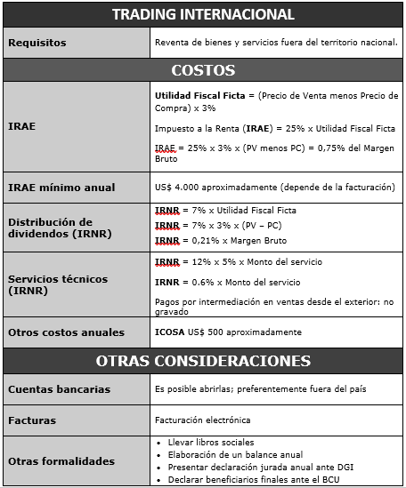 • Si la empresa no tiene activos en Uruguay y no realiza otras actividades en nuestro país, estaría gravada únicamente por el Impuesto a la Renta, por lo que anualmente deberá presentar un balance no auditado y una declaración jurada de impuestos a la Dirección General Impositiva a efectos de abonar los impuestos correspondientes (básicamente el Impuesto a la Renta que se calcula de la forma indicada en el ejemplo precedente y un impuesto a la existencia de la sociedad de aproximadamente USD 500 anuales – ICOSA-).