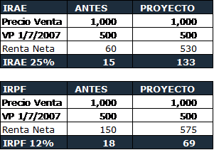 El proyecto de ley propone que la renta neta se calcule como la sumatoria del importe resultante de aplicar el porcentaje que corresponda (dependiendo del impuesto que se trate) sobre el valor en plaza del inmueble al 1º de julio del 2007, más la diferencia entre el precio de venta y el referido valor en plaza.