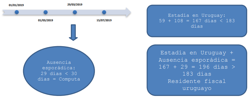 Como ejemplo de lo anterior, supongamos que una persona ingresó al país el 01/01/2019 y se retiró definitivamente el 15/07/2019, no habiendo estado en Uruguay por el período del 01/03/2019 hasta el 29/03/2019 inclusive. Si bien el contribuyente salió del territorio nacional, la ley obliga a computar estos días fuera del mismo por ser menor a 30 días, de manera que el contribuyente será considerado residente fiscal uruguayo, como muestra la siguiente imagen: