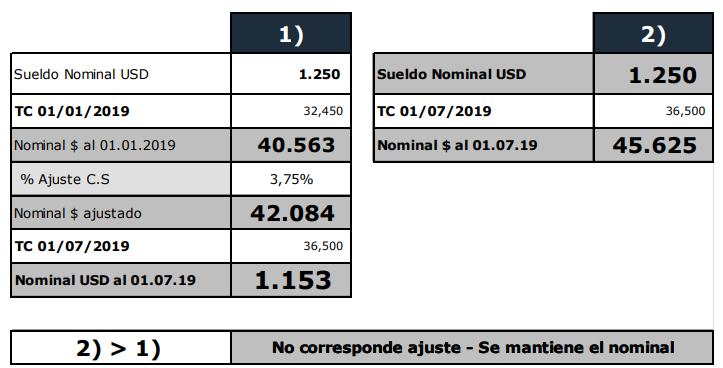 Según la resolución efectuada por el M.T.S.S en marzo del 2009, los sueldos que son abonados en moneda extranjera deben ser ajustados por el Consejo de Salarios de su grupo de actividad laboral.