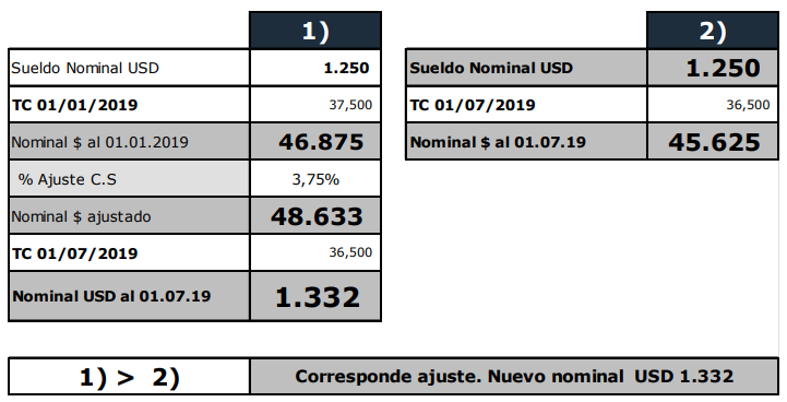 II. Por otra parte, tomar el sueldo en moneda vigente, realizar la conversión a pesos aplicando el tipo de cambio a la fecha del ajuste.