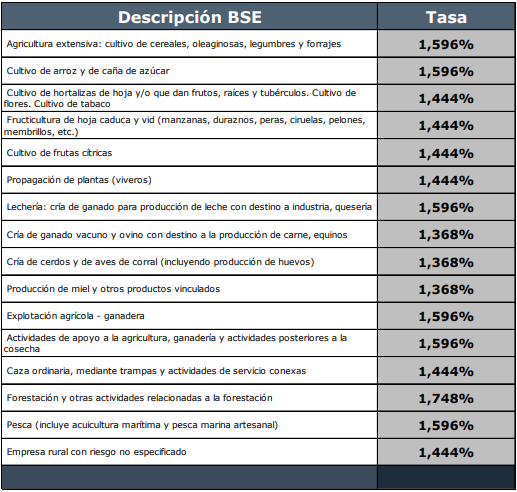 Seguros del Estado (en delante BSE) teniendo en cuenta la peligrosidad del riesgo para cada subsector de actividad y establecimientos donde se desarrolla dicha actividad. Con las modificaciones establecidas por la Ley, cada empresa declarada bajo el régimen rural deberá contratar una póliza individual en el BSE a partir del 1° de enero de 2020.