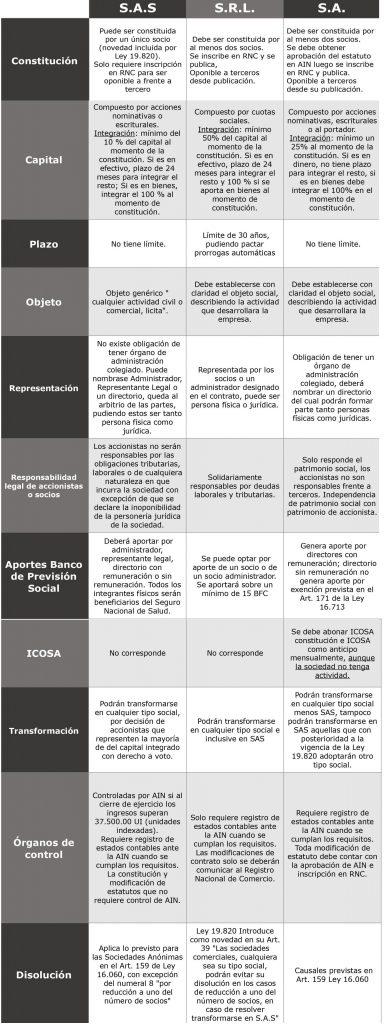 A continuación, realizamos un cuadro comparativo de los principales aspectos societarios: