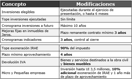Asimismo, se incorpora también al Decreto N° 150/007 el Artículo 154 Quáter, en el cual se dispone que las exoneraciones que se apliquen sobre la renta neta fiscal o sobre el impuesto, provenientes de una actividad promovida en virtud de una declaratoria promocional sectorial al amparo del artículo 11 de la Ley Nº 16.906, no podrán ser objeto de ningún otro beneficio en materia de IRAE. Tampoco podrá exonerarse al amparo de cualquier otro régimen, el impuesto correspondiente a la parte de la renta neta no exonerada en virtud de dicha declaratoria.
